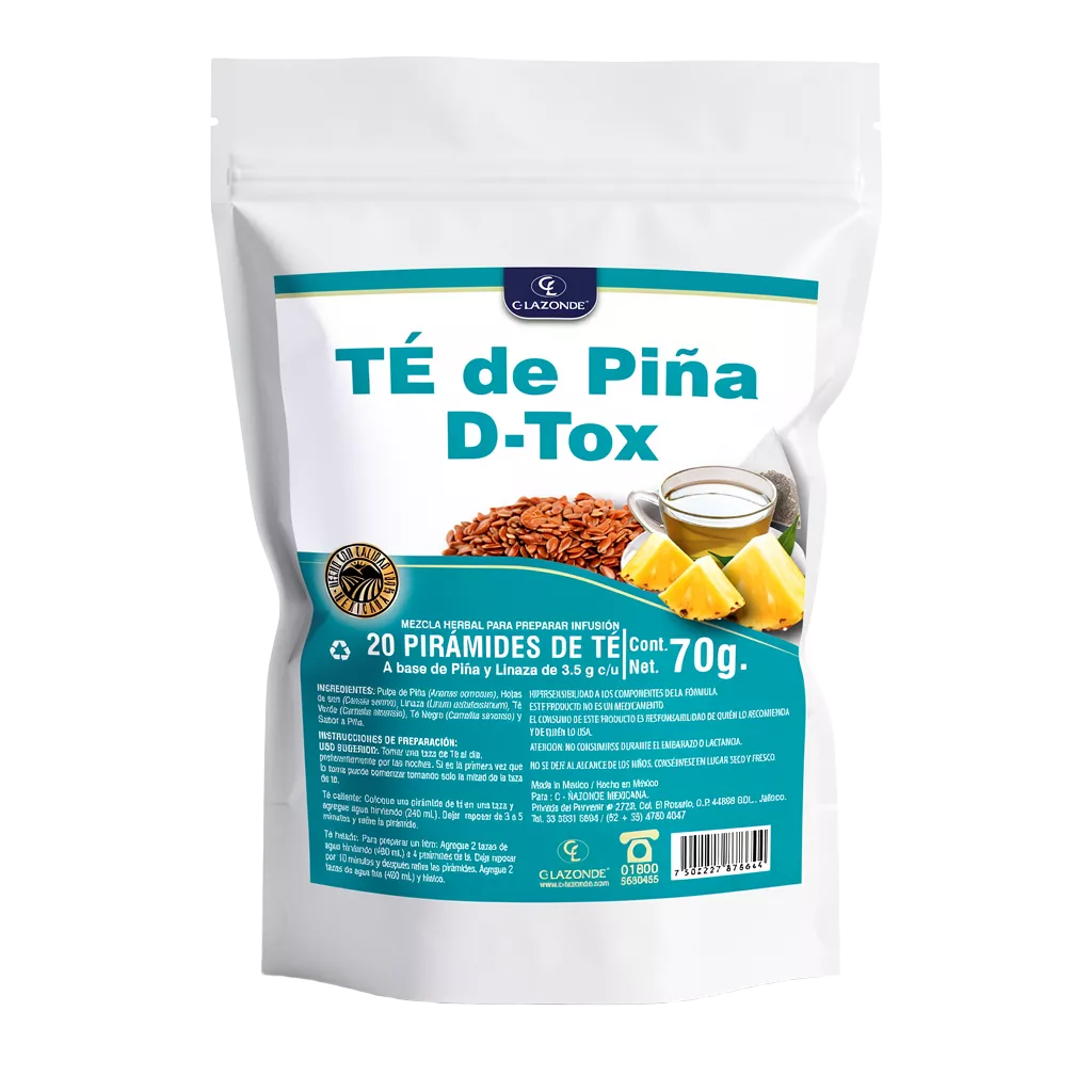Té de Piña D-Tox es una infusión funcional elaborada con ingredientes 100 % naturales como pulpa de piña, linaza, hojas de sen y té verde, formulada para apoyar la digestión, mejorar el tránsito intestinal y favorecer la eliminación de líquidos retenidos en el organismo. Contiene bromelina, una enzima natural presente en la piña que contribuye a la digestión de proteínas, apoya el metabolismo de las grasas y posee propiedades antiinflamatorias. La linaza aporta fibra y ácidos grasos omega 3 que favorecen el equilibrio digestivo y el cuidado de la microbiota intestinal, mientras que el té verde aporta antioxidantes que apoyan el metabolismo y el bienestar general. Ideal como complemento en rutinas detox y estilos de vida saludables. Presentación en 20 pirámides de 3.5 g cada una, contenido neto 70 g.
